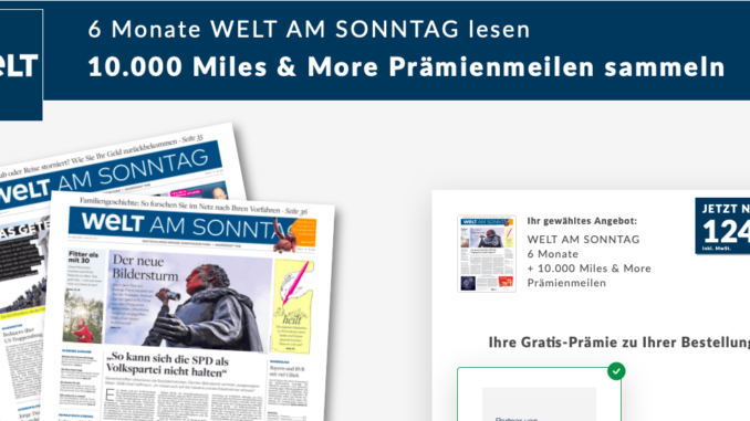 Dass man mit Zeitungsabonnements sehr effektiv Miles&More Prämienmeilen sammeln kann, habe ich bereits hier und da erwähnt. Aktuell bieten die WELT am Sonntag wieder eine Aktion an, bei welcher Ihr für den Abschluss eines 6 Monats Abos 10.000 Prämienmeilen gutgeschrieben bekommt. Das 6 Monats Abo kostet 124,80, womit sich eine Ratio von 12,48 Euro pro 1.000 Prämienmeilen ergibt. Dies ist ein recht günstiger Wert, insbesondere wenn man die Zeitung auch wirklich lesen möchte und die Meilen für First- oder Business Class Prämienflüge einlöst.
