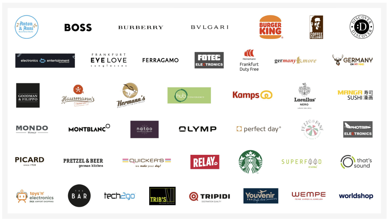 Anton & Anni, BOSS, Burberry, Burger King, BVLGARI, Coffee Fellows, Discover, electronics & entertainment, Eye Love, Fotec, Ferragamo, Frankfurt Duty Free, Frankfurt Airport Online Shop (Home Delivery), Germany & More, Germany on My Mind, Goodman & Filippo, Hausbar, Hausmann’s, Hermann’s, Hub Convenience, Kamps, Lucullus, Manga Sushi, Mondo, Montblanc, Natoo, Olymp, Perfect Day, Pezzo di Pane, Photair, Picard, Pretzel & Beer, Quicker’s, Relay, Starbucks, Superfood, tech2go, that’s sound, The Bar, toys’n’electronics, Trib’s, Tripidi, Wempe, Worldshop, Youvenir.