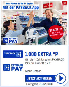 Zusätzlich zu dieser Aktion gibt es bis zum 31.12. bei jeder Bezahlung mit Payback Pay dreifach Punkte auf die Einkaufssumme (außer bei Penny). Meist kann man auch mehrere Coupons kombinieren und somit die Punkte-Endsumme weiter erhöhen.