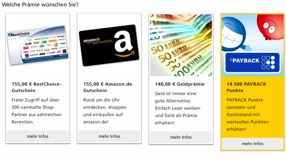 Um für das Brigitte Abo auch die vollen 14.600 Miles&More Meilen zu bekommen, müsst Ihr bei der Abo Art „einen neuen Leser werben“ und das 1 Jahres Prämienabo anwählen. Als Prämie wählt Ihr dann 14.500 Payback Punkte. Zusammen mit den 100 Basispunkten für das Abo, erhaltet Ihr also 14.600 Payback Punkte.