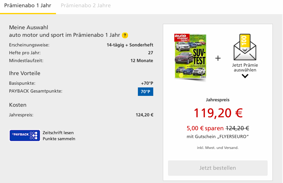 Neben dem Brigitte Abo mit 8.050 Prämienmeilen gibt es auch noch die Auto, Motor und Sport mit 10.070 Prämienmeilen. Aber Achtung: die erhöhten Prämien gibt es nur am Black Friday (23.11.2018)!