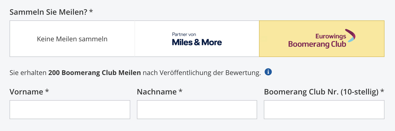 - Die Gutschrift der Prämienmeilen erhalten Sie ca. zwei Wochen nach Veröffentlichung der Bewertung.
