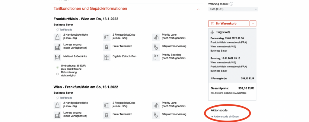 - Der Aktionscode kann nur auf www.austrian.com eingelöst werden. Der Aktionscode gilt nicht in Verbindung mit einem „Zugangscode“, der zum Kauf bereits ermäßigter Tarife verwendet wird.