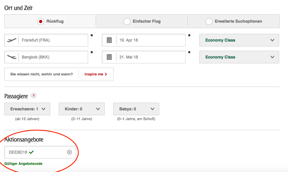 Dort lässt sich dann unterhalb der Buchungsmaske der Gutscheincode: DEEBD18 eingeben.