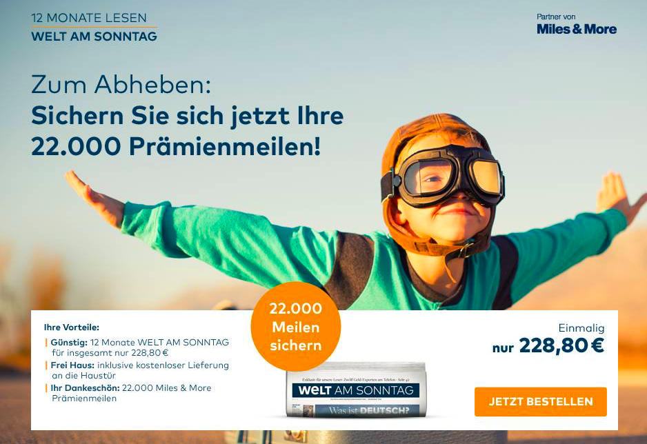 Dass man mit Zeitungsabonnements sehr effektiv Miles&More Prämienmeilen sammeln kann, habe ich bereits hier und da erwähnt. Aktuell bieten die WELT am Sonntag wieder eine Aktion an, bei welcher Ihr für den Abschluss eines 12 Monats Abos 22.000 Prämienmeilen gutgeschrieben bekommt. Das 12 Monats Abo kostet 228,20 Euro, womit sich ein „Meilenpreis“ von 10,40 Euro pro 1.000 Prämienmeilen ergibt. Dies ist ein recht günstiger Wert, insbesondere wenn man die Zeitung auch wirklich lesen möchte und die Meilen für First- oder Business Class Prämienflüge einlöst.