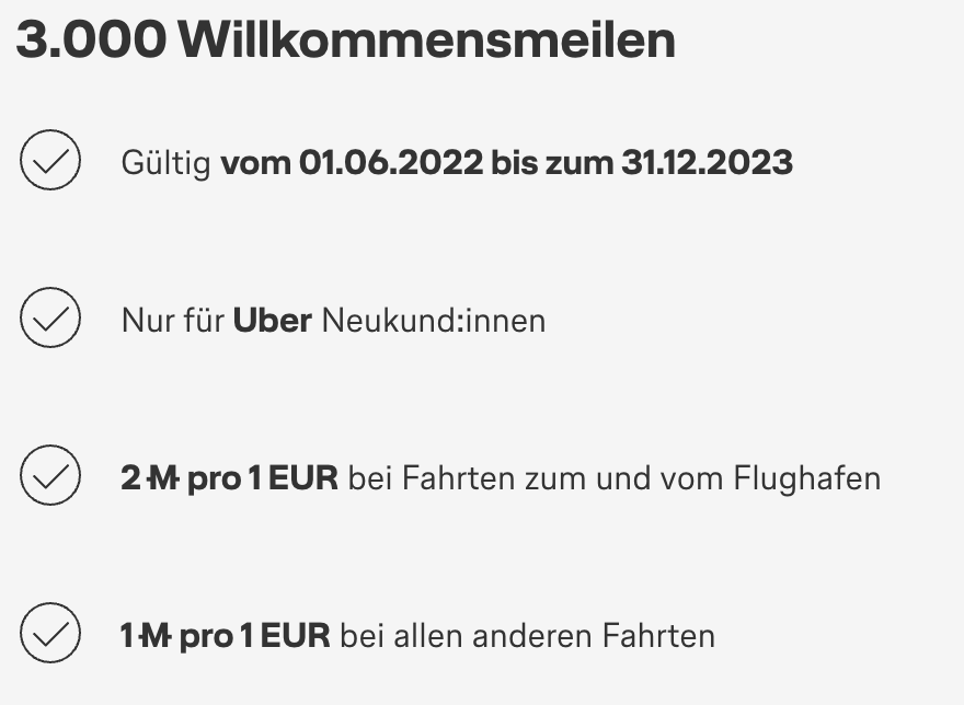 - Der Willkommensbonus ist nur für Neukund:innen verfügbar, die noch keine Fahrt über die Uber App gebucht haben. Der Willkommensbonus in Höhe von 3.000 Prämienmeilen wird Ihnen eine Woche nach Ihrer ersten Fahrt gutgeschrieben.