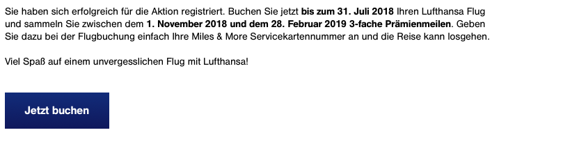 Diese Aktion scheint auch wieder „targed“ zu sein, da man sie nicht auf der Miles&More Homepage findet und man sich hierfür anmelden muss. Ich empfehle daher einmal in das Email Postfach zu schauen, ob man hier nicht eine Einladung erhalten hat.