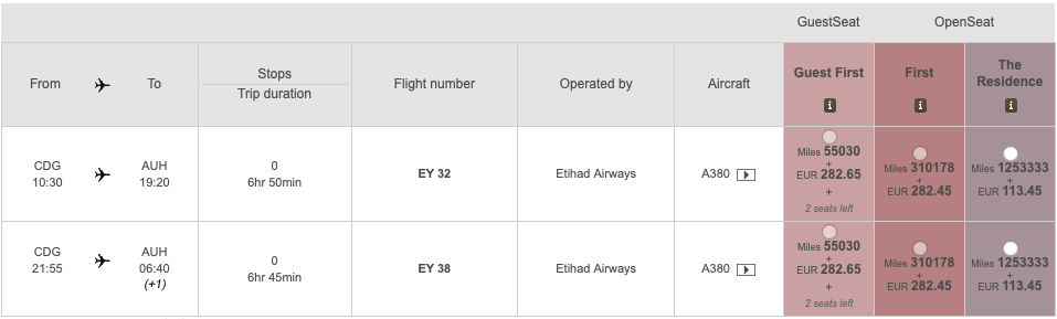 Aber auch die fantastischen Etihad Airways First Class Apartments lassen sich mit dieser Aktion für nur 55.030 Meilen von Paris nach Abu Dhabi buchen. Grundsätzlich funktioniert diese Aktion aber auf allen Strecken.