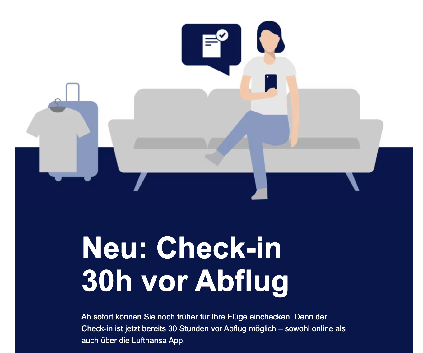 Aus unserer Erfahrung heraus konnte man den Check in bisher auch schon ein wenig vor diesem 24-Stunden Fenster machen, nun ist das aber offiziell und gilt für die meisten Flüge. Die Kunden der Lufthansa können laut einer Mail ab sofort sowohl online als auch in der App jetzt 30 Stunden vor dem Start die Bordkarten beziehen.