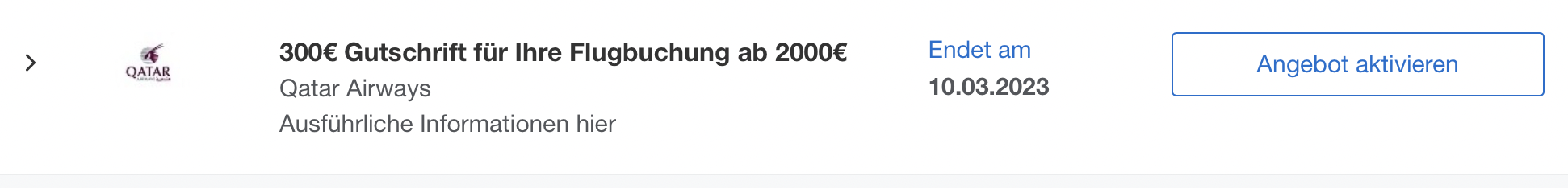 - Für Ihre Qatar Airways-Flugbuchung ab 2.000€ erhalten Sie eine einmalige Gutschrift über 300€. Das Angebot gilt bis zum 10.03.2023 bei Zahlung mit Ihrer American Express Karte. Verfügbar für die ersten 30.000 Karteninhaber:innen, die sich für das Angebot anmelden. Es gelten die nachstehenden Teilnahmebedingungen.