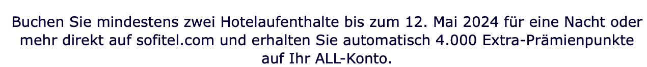 Accor hat eine neue Promo für Gäste von Sofitel gezündet, Teilnehmerinnen und Teilnehmer von dem Vielschläferprogramm ALL Accor Live Limitless können 4.000 Bonuspunkte einsacken. Um dieses Extra im Wert von 80 Euro zu erhalten, wird eine Buchung von mindestens zwei Nächten vorausgesetzt. Die Reservierung muss bis zum 14. April getätigt werden, die Aufenthalte müssen bis zum 12. Mai stattfinden.