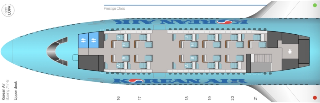 Spannend wird hier tatsächlich sein wie genau die neue Allegris Business Class bei Lufthansa im Oberdeck der Boeing 747-8 aussehen wird. Eine Orientierung könnte hier unter Umständen Korean Air sein, welche im Oberdeck der Boeing 747-8 auch einen Teil der Business Class installiert haben und mit ihrer versetzten 1-1 Anordnung verbaut man hier gerade einmal 22 Sitze, wobei hier sicherlich auch Raum für Optimierungen wäre.