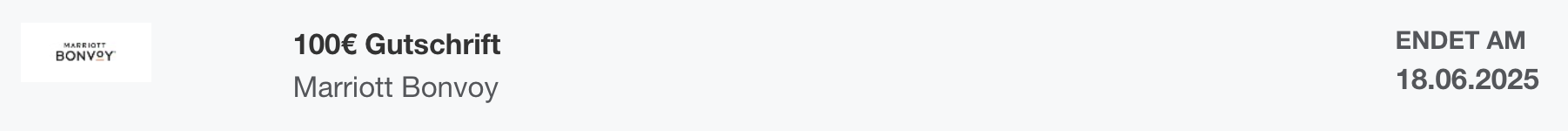 Angebot aktivieren, bis zum 18/06/2025 bei teilnehmenden Marriott Bonvoy Hotels insgesamt mindestens 500€ ausgeben und einmalig 100€ Gutschrift erhalten.
