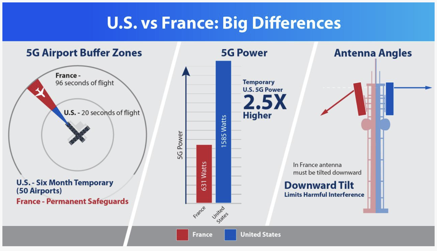 So ist die Sendeleistung der 5G Antennen in den USA bis zu 3 mal höher als in Europa und die Antennen wurden in den USA im 90° Winkel zum Boden montiert, was dazu führt, dass sie im selben Maße in den Himmel abstrahlen, wie in Richtung Boden. Damit hat man zwar besseren Empfang im Flugzeug, aber im Sinne des Erfinders liegt dies eigentlich nicht. In Europa und Japan hat man die Antennen mit einem leichten Winkel Richtung Boden montiert.