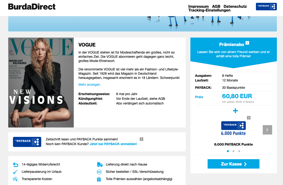 Mit der VOUGE gibt es gerade ein Abo, welches schon fast zu gut ist um wahr zu sein, denn man kann Meilen für 10,08 Euro pro 1.000 Meilen sammeln. Dabei gibt jedes Abo zum Preis von 60,80 Euro auch oderendliche 6.030 Payback Punkte und damit auch Miles&More Prämienmeilen. Wer mehr will, kann das Abo auch mehrfach abschließen, bzw. verschenken. Mehr dazu weiter unten in den Details.