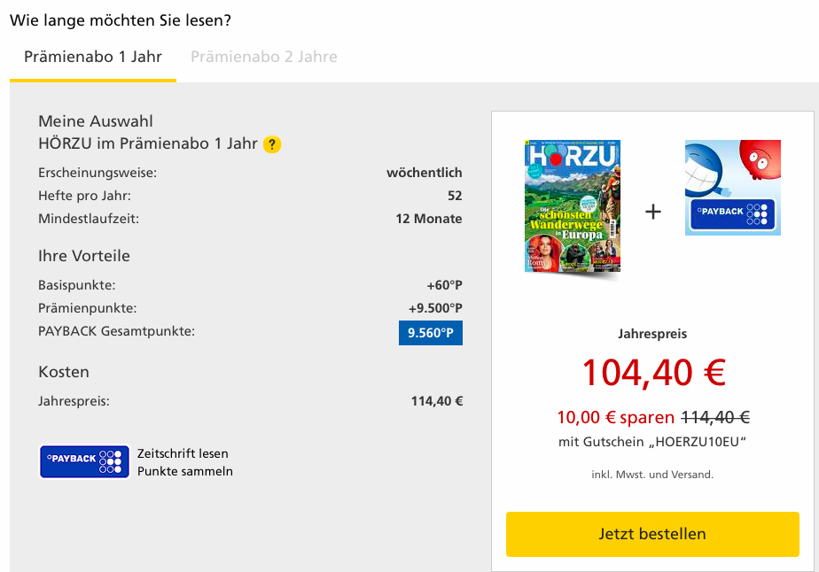 Meilen mit Zeitungsabos zu sammeln ist bekanntermaßen eine bewährte Methode um das Meilenkonto schneller zu füllen. Ein besonders gutes Angebot um an gleich 9.560 Meilen zu kommen, hat momentan der Deutsche Post Leserservice mit dem HÖRZU 12 Monatsabo. Dank dem zehn Euro Gutschein HOERZU10EU wird das Abo nochmals günstiger und kostet nur noch 104,40 Euro. Damit entsteht ein sehr gute Meilenpreis von 10,92 Euro pro 1.000 Meilen.