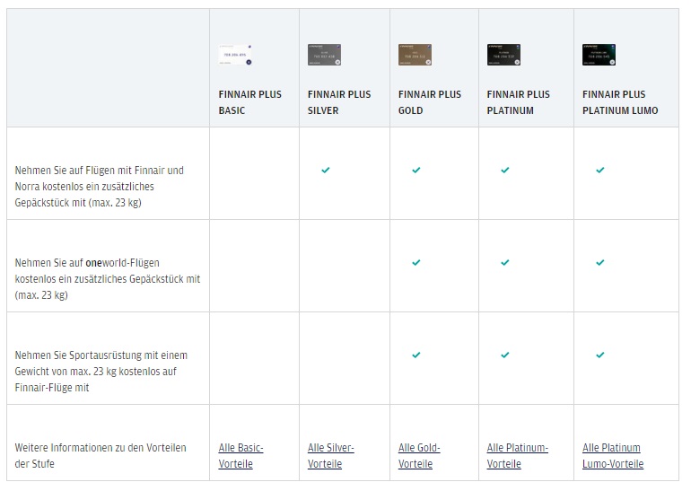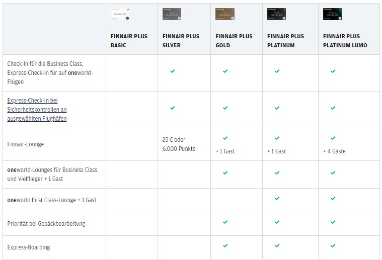 Neben dem Basic Status verfügt Finnair Plus über vier höhere Statusstufen. Beginnend mit dem Finnair Plus Silver (entspricht Oneworld Ruby), dem höheren Gold Status (Oneworld Sapphire) und den höchsten Status Platinum und Platinum Lumo (Oneworld Emerald).