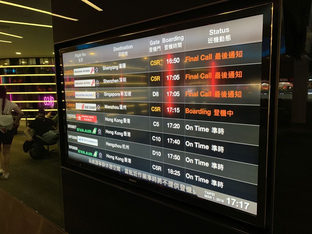 Wir nahmen also nur einen kleinen Snack zu uns und machten uns recht zeitig auf den Weg in Richtung Gate 10, welches glücklicherweise im gleichen Terminal war, wie die Infinity Lounge. Das Boarding war für 17:40 Uhr angezeigt und auch nur kurz danach begann das Boarding für unseren Flug BR857 nach Hongkong.