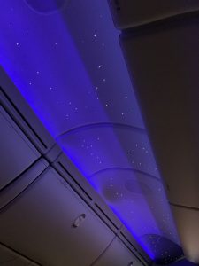 Irgendwann hat die Crew dann das Kabinenlicht abgedunkelt und ein weiteres kleines Highlight kam zum Vorschein. Die Decke des Dreamliners wird wie ein Sternenhimmel beleuchtet.