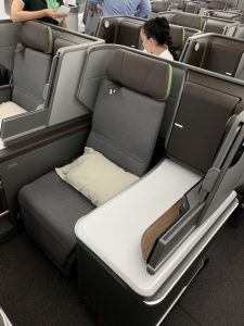 Die Business Class, die in der Boeing 787-9 auch Royal Laurel Class – das ist für EVA Air die hochwertigste Business Class – genannt wird, ist in einer 1-2-1 Sitz-Konfiguration angeordnet. Die Sitze sind vollständig in Flugrichtung ausgerichtet und haben natürlich alle Zugang zum Gang. Reist ihr zu zweit, gibt es leider das kleine Manko, dass man selbst in der Mitte nicht direkt nebeneinander sitzt. Die Sitze sind immer versetzt und haben mindestens eine Konsole und eine Trennwand zwischen Euch und Eurem Mitreisenden. Die Trennwand lässt sich zwar einfahren, trotzdem ist dann immer noch der direkt Blick zu eurem Sitznachbarn versperrt.