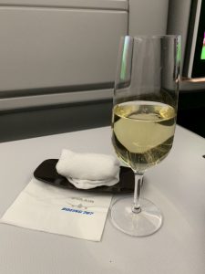 Wie selbstverständlich wurde uns vor dem Start ein Getränk und ein Erfrischungstuch angeboten. Wir wählten wie üblich Champagner und ließen uns überraschen, ob EVA Air auch auf dieser Strecke Veuve Cliquot Grand Dame oder Krug serviert. Schließlich flogen wir ja mit der Royal Laurel Class. Leider war dem nicht so. Wie auf unserem Flug nach Taipei servierte man einen Delamotte Blanc de Blancs 2007.