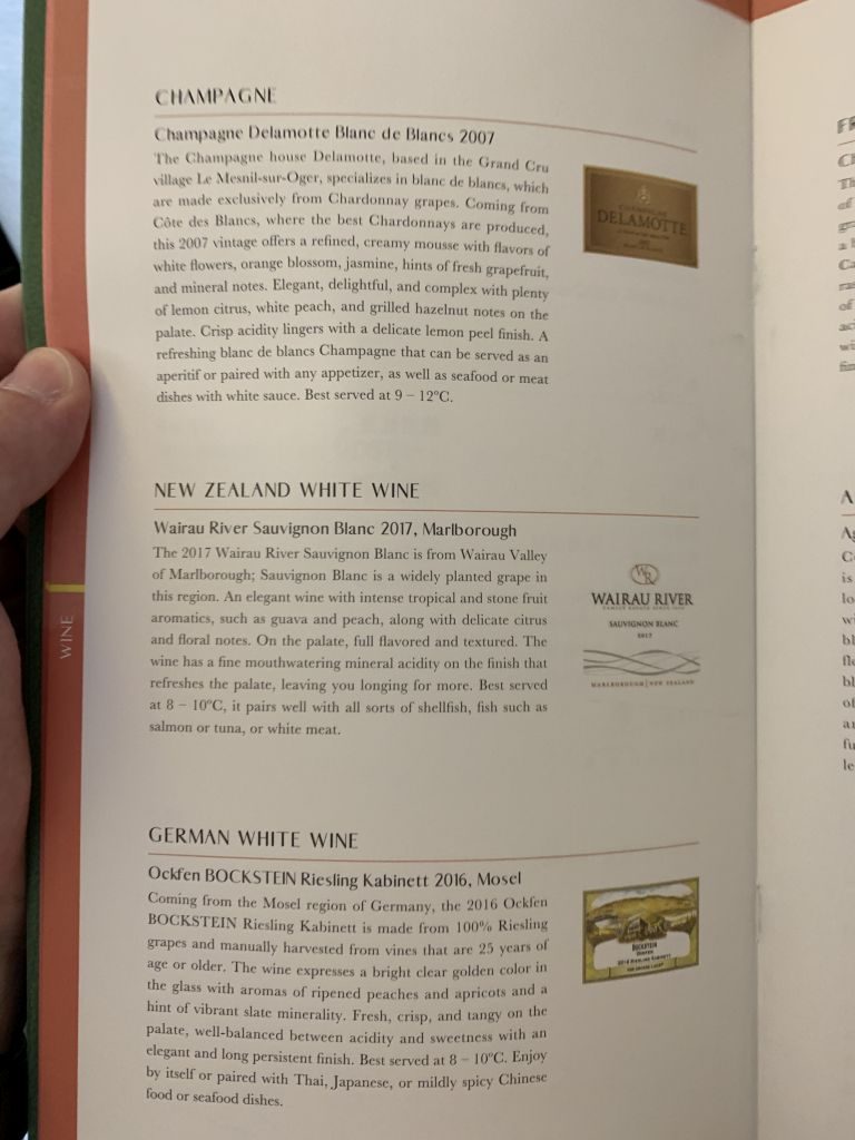 Nach dem Start servierte die Crew schnell die nächste Runde Getränke. Wir blieben beim Champagner, obwohl die restliche Getränke-Auswahl für die kurze Flugzeit auch sehr umfangreich war. So bot die Weinkarte folgende Optionen: