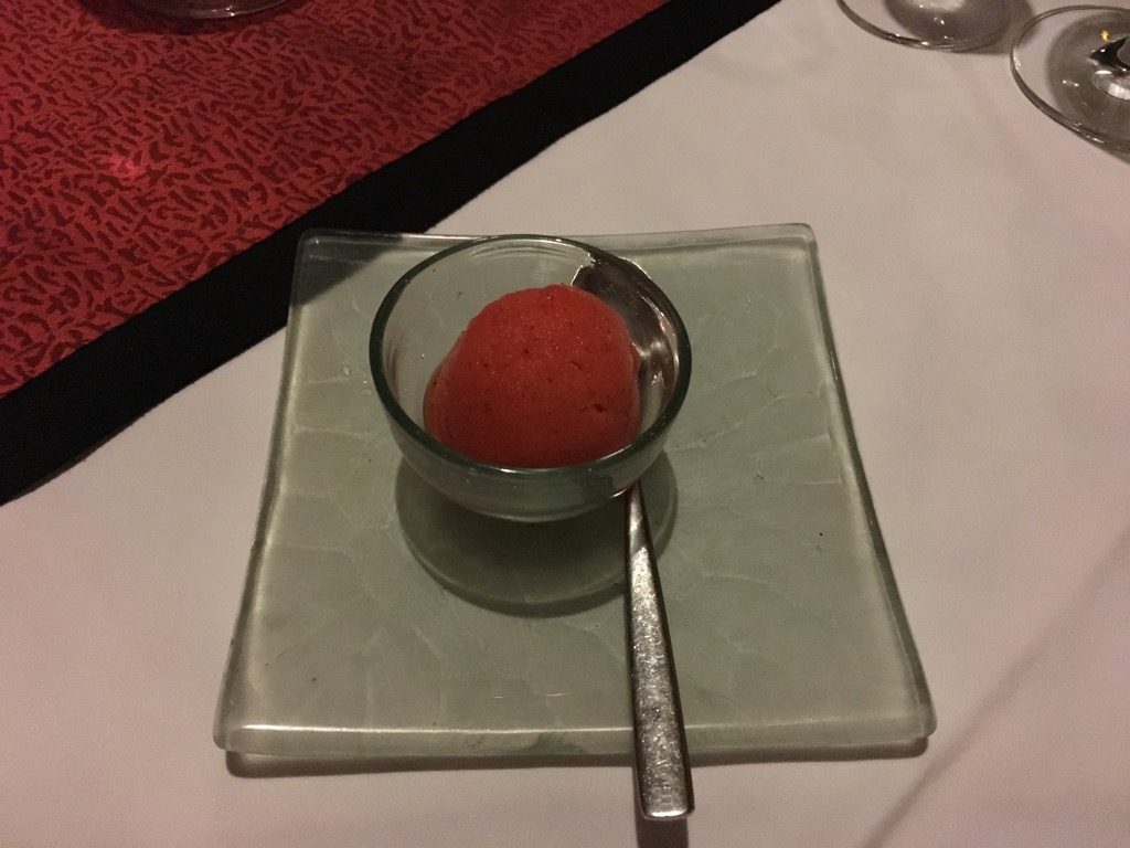 Zwischen den Vorspeisen und der Hauptspeise wurde ein Sorbet gereicht. Zu diesem Zeitpunkt ist mir erst aufgefallen, dass unser Kellner permanent nur wenige Meter von uns entfernt stand. Dies hatte auch den Vorteil, dass man nie auch nur ein annähernd leeres Wasser oder Weinglas hatte.