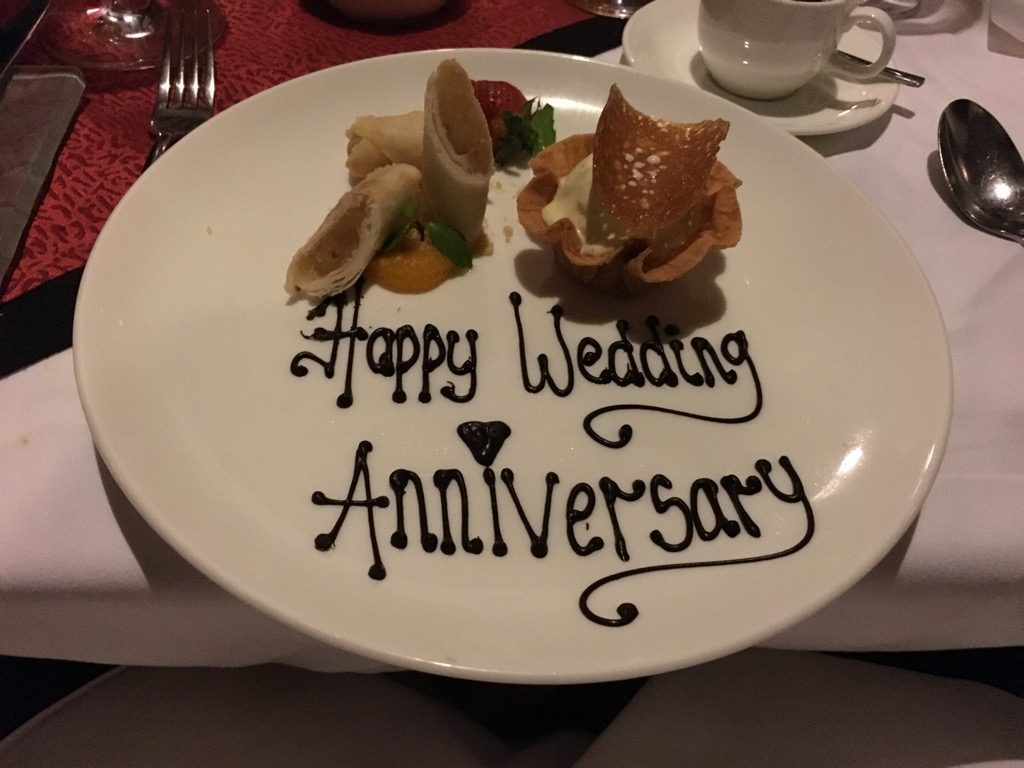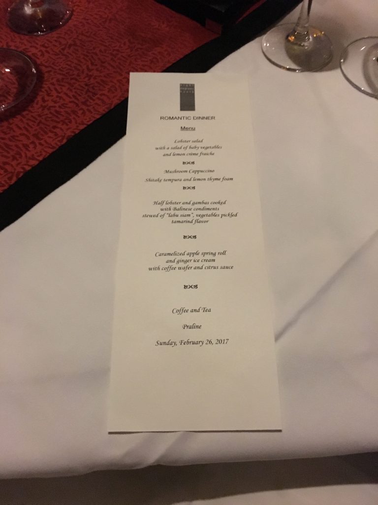 Die Apfel-Frühlingsrollen mit Ingwer Eis zum Dessert waren fantastisch. Ein wenig amüsant fanden wir auch die Gratulation zum Hochzeitstag. Zwar haben wir im Conrad Bali unseren Jahrestag gefeiert, allerdings waren wir zu diesem Zeitpunkt ja noch nicht verheiratet. Aber es war ein gutes Vorzeichen.
