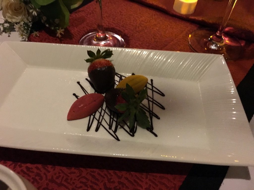 Zum Abschluss des Essen gab es dann noch Kaffee oder Tee und einen wunderschönen Pralinenteller mit Schokoladenerdbeeren und zwei Pralinen.