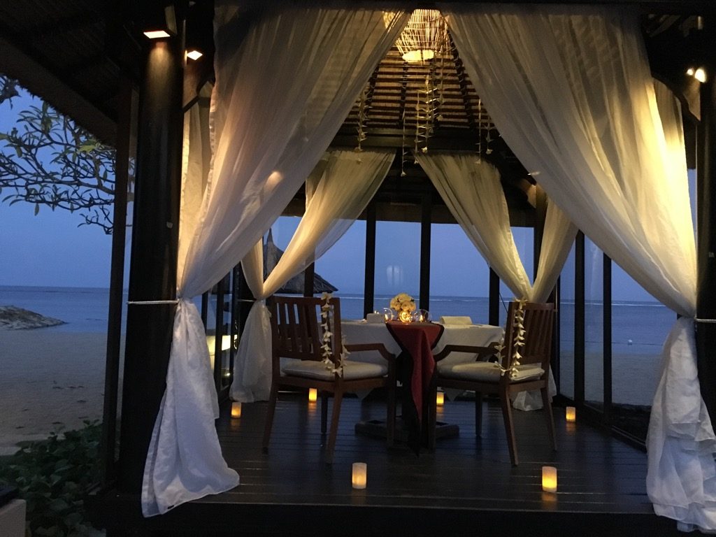 Das Conrad Bali hat einen ganz besonderen Platz in meinem Herzen und wir sind immer wieder gerne hier. Das Hotel ist insbesondere gut auf Honeymooner oder auch Hochzeiten eingerichtet und so bietet eines der Restaurants, das „Eight Degrees South“ an einigen Abenden auch die Möglichkeit in kleinen Cabanas am Strand ein wunderschönes, privates Dinner einzunehmen.