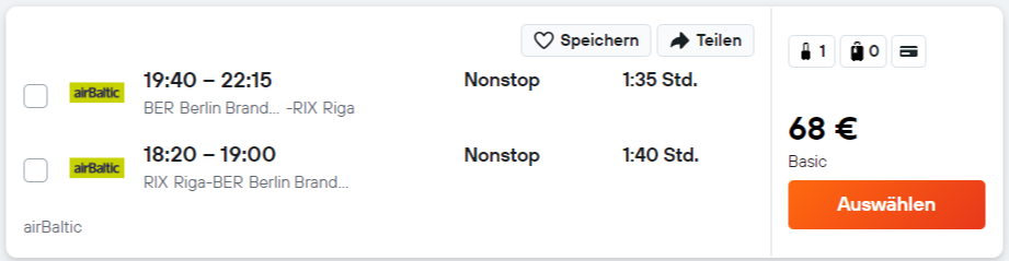Bei diesem Air Baltic Economy Class-Angebot ab Berlin handelt es sich um die „Green Fare“. Das ist bei Air Baltic kein besonders umweltfreundlicher Tarif, sondern vergleichbar mit einem Basic Economy-Tarif – jedoch mit dem Vorteil, dass ein echtes Handgepäckstück, wie ein Trolley, mit in die Kabine genommen werden darf.