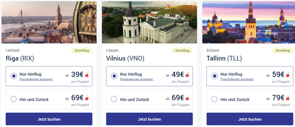 Air Baltic hat noch bis zum 5. September 2024 einen Sale für Flugtickets. Auch ab Deutschland lassen sich dabei Ziele günstig buchen, sogar mit einem sehr offenen Reisezeitraum vom 16. September 2024 bis 15. Juni 2025. Dank bester Verfügbarkeiten könnt Ihr Euch Euren Reisetermin fast frei wählen. Besonders günstig sind dabei die Direktflüge von Berlin nach Riga, Vilnius und Tallinn. Alle drei Ziele gibt es bereits ab 68 Euro.