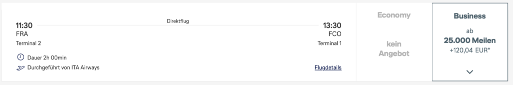 Auch wenn Miles&More auf der eignen Webseite ITA Airways noch nicht als Partner listet, ist es bereits möglich Flüge mit ITA Airways online zu buchen. Die Flüge von ITA Airways tauchen in der Onlinebuchung bei Miles&More bereits auf und man kann sie zu dem selben Preis buchen wie Lufthansa Flüge. Allerdings sind bei unseren ersten Tests die Steuern und Gebühren bei ITA Airways etwas höher als bei Lufthansa selbst.