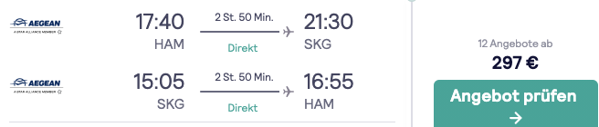 Wir haben einige günstige Tarife bei Skyscanner gefunden. So zum Beispiel den Flug von Berlin nach Thessaloniki, dieser ist dort sogar etwas günstiger als auf der Homepage von Aegean selbst: