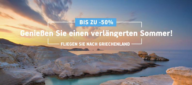 Das Angebot gilt für alle Direkt- und Umsteigeverbindungen von/nach Griechenland. Buchbar bis 30.08.2021 für Reisen vom 13.09.2021 bis 27.03.2022. Die 20%ige Ermäßigung gilt für im Reisezeitraum vom 13.09.2021 bis 31.10.2021. Die 40%ige Ermäßigung gilt für im Reisezeitraum vom 01.11.2021 bis 09.01.2022. Die 50%ige Ermäßigung gilt für im Reisezeitraum vom 10.01.2022 bis 27.03.2022. Die 20&, 40% & 50%ige Ermäßigung bezieht sich auf alle Tarife und Treibstoffzuschläge, aller Direktflüge. Die in den Reservierungssystemen aufgeführten Tarife und Treibstoffzuschläge sind bereits um 20%, 40% 50% reduziert. Die Ermäßigung gilt nicht auf Steuern und Ticketausstellungs. Bei Umbuchungen können je nach Tarifkategorie Gebühren anfallen. Bei Ticketstornierung gilt die Erstattungsregel des angewandten Tarifes. Die Aktion endet am 30.08.2021 um 23:59 Uhr griechischer Zeit.