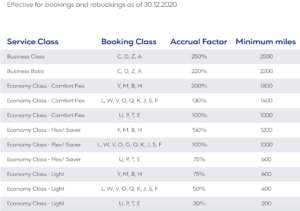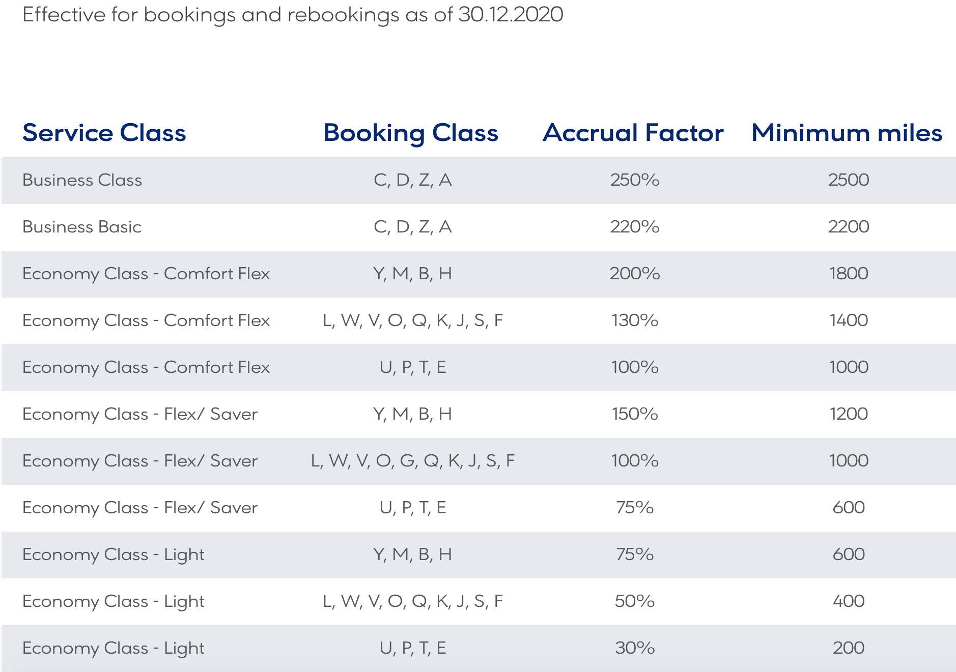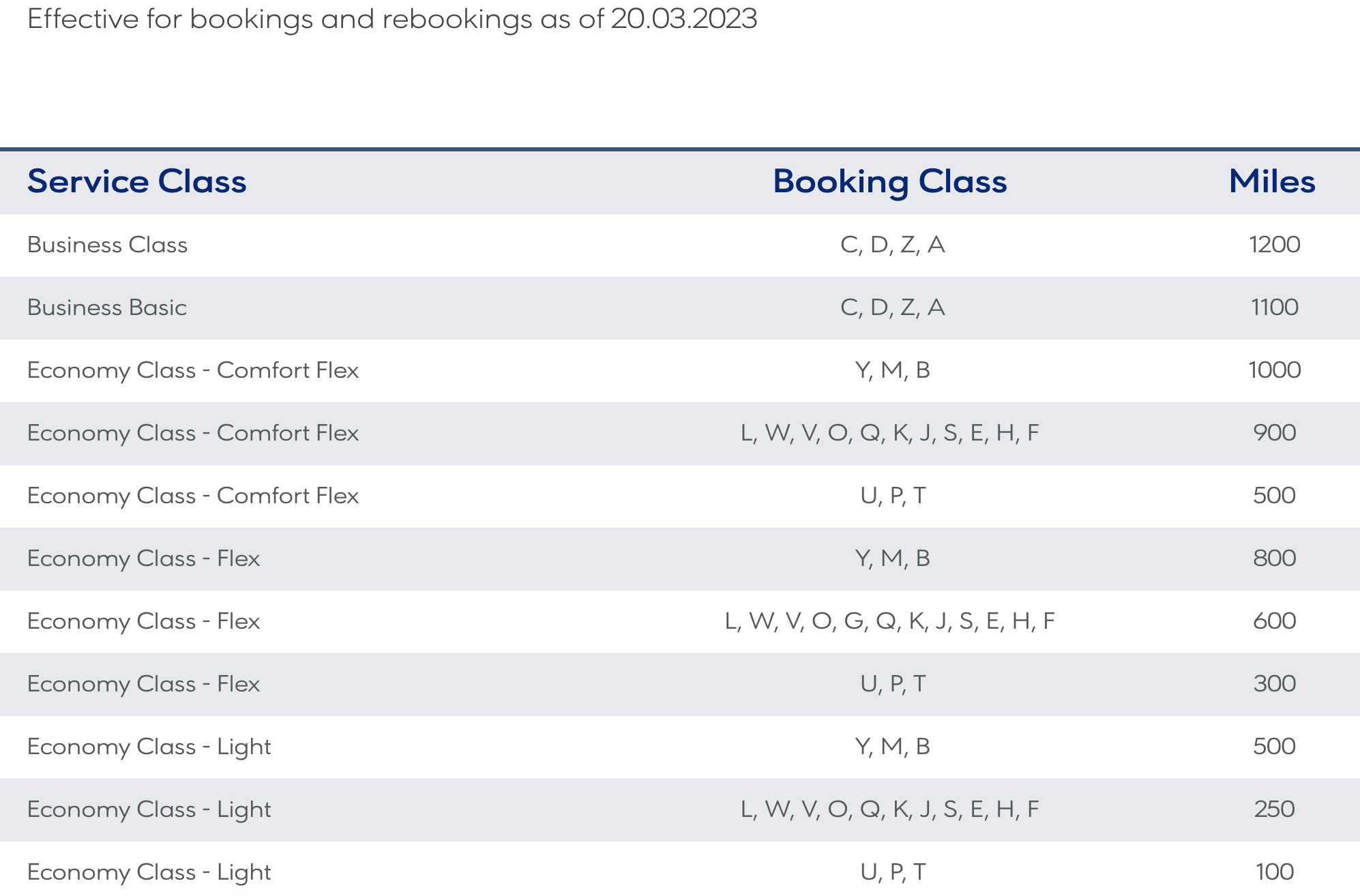 | Service Class | Booking Class | Miles (ab 20.03) (bis 19.03) |