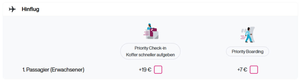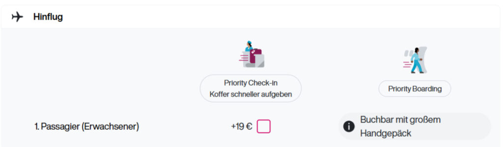 Doch jetzt kommt der große Haken: 7 Euro klingt wenig. Aber das Priority Boarding ist nur dann kostenpflichtig zubuchbar, wenn ihr euch für ein großes Handgepäckstück an Bord entscheidet, was häufig schon über 30 Euro kostet. Dazu kommen dann nochmals sieben Euro, um statt mit der Gruppe 2 schon mit der Gruppe 1 einzusteigen.