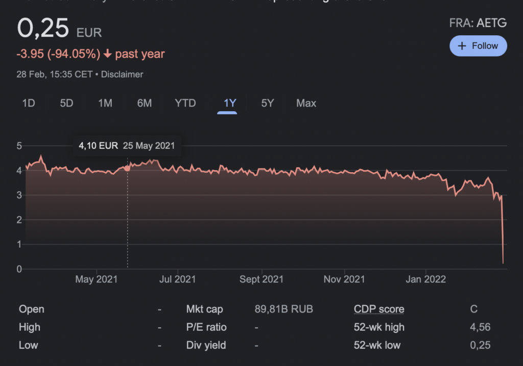 Gerade Aeroflot, welche sehr viele Langstrecken in die ganze Welt anbietet, ist hierbei natürlich sehr schwer von den Sanktionen getroffen. Die Aktie der Airline ist nach der Wiederaufnahme des Handels kollabiert und um 95% gefallen. Damit ist Aeroflot nun ein Pennystock und die meist sehr feinfühligen Finanzmärkte erwarten offensichtlich eine sehr dramatische Zukunft für die Airline.