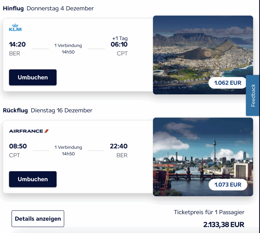 Das Beste an diesen Angeboten ist aber, dass die Flüge zu diesen Preise auch problemlos im Winter 2025/2026 verfügbar sind. Der Europäische Winter ist die beste Reisezeit für Südafrika, da hier auf der Südhalbkugel gerade Sommer ist und normalerweise sind Flüge, gerade in der Business Class hier deutlich teurer.