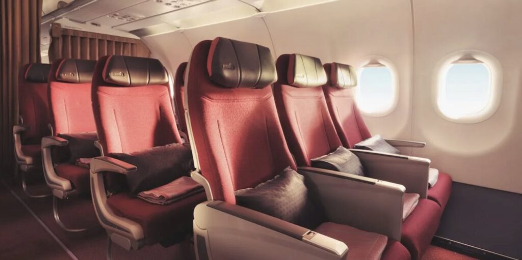 Insgesamt 24 Premium Economy Class Sitze will man in jedem Airbus A320neo an Bord haben und der Bordservice soll hier auch aufgewertet sein. Was genau das bedeutet ist allerdings nicht ganz klar, allerdings wird die Kabine mit Vorhängen von der Economy Class angrenzt.