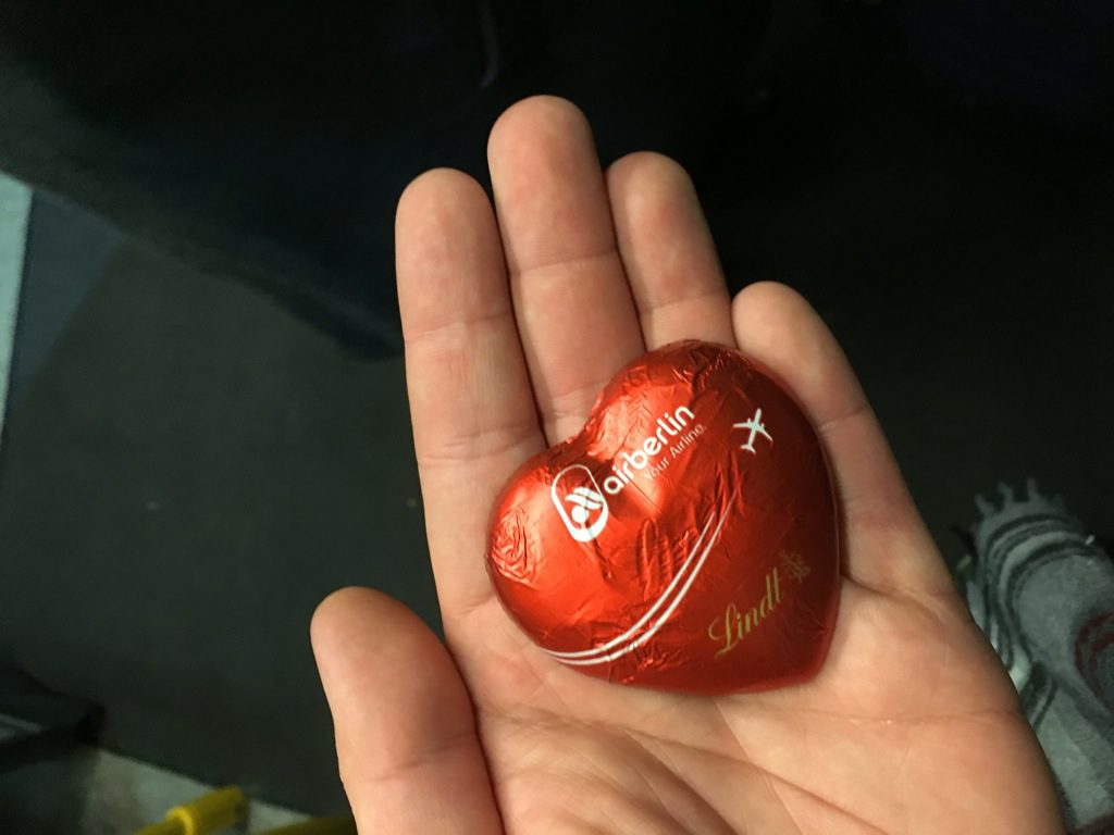 Die beliebten Schokoladenherzen, welche man zum Abschied bei jedem airberlin Flug erhalten hat, sind auch Bestandteil der Auktion. Dabei werden sie immer im 100er Pack verkauft, also 2 kg Schokolade. Die Preise bewegen sich aktuell zwischen 30 und 332 Euro.