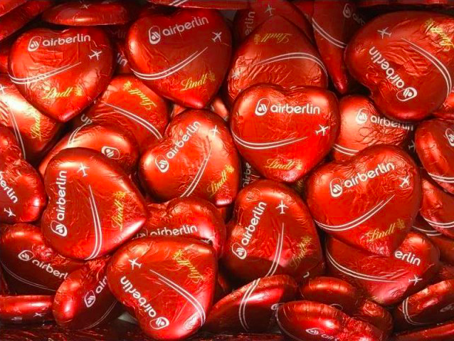 Die beliebten Schokoladenherzen, welche man zum Abschied bei jedem airberlin Flug erhalten hat, sind auch Bestandteil der Auktion. Dabei werden sie immer im 100er Pack verkauft, also 2 kg Schokolade. Die Preise bewegen sich aktuell zwischen 30 und 332 Euro.