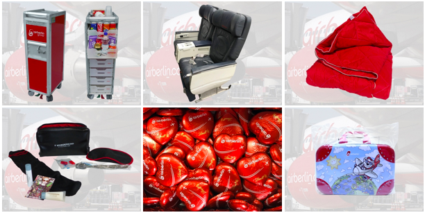 Das Auktionshaus Dechow versteigert aktuell einen goßen Teil des airberlin Inventars. Darunter sind neben alten Sitzen und Serviertrolleys, teilweise inkl. Geschirr, auch eine Reihe von Amenity Kits, airberlin Merchandise und natürlich auch Kiloweise Schokoladenherzen.
