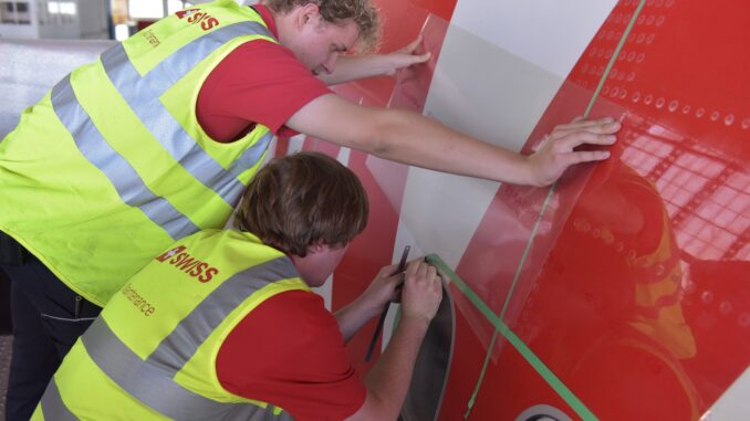 Für das Bekleben einer einzigen 777 benötigt man rund 950 Quadratmeter Folie und eine Woche Zeit. Und so dauerte es auch einige Zeit, bis SWISS die vollständige Boeing 777-Flotte mit der treibstoffsparenden Technologie ausstatten konnte. Doch mit der HB-JNF wurde nun auch das letzte Flugzeug umgerüstet.