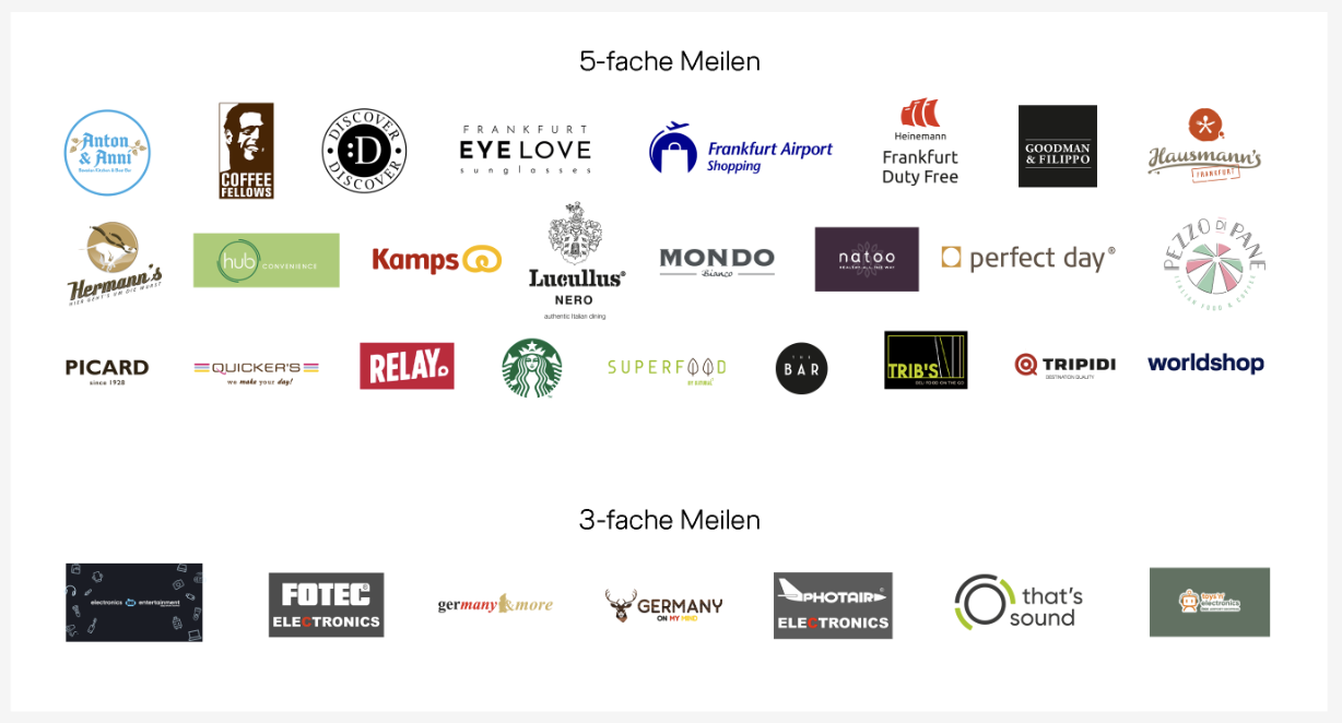 - Bis zu 5-fache Meilen bei rund 100 Shops und Food-Konzepten