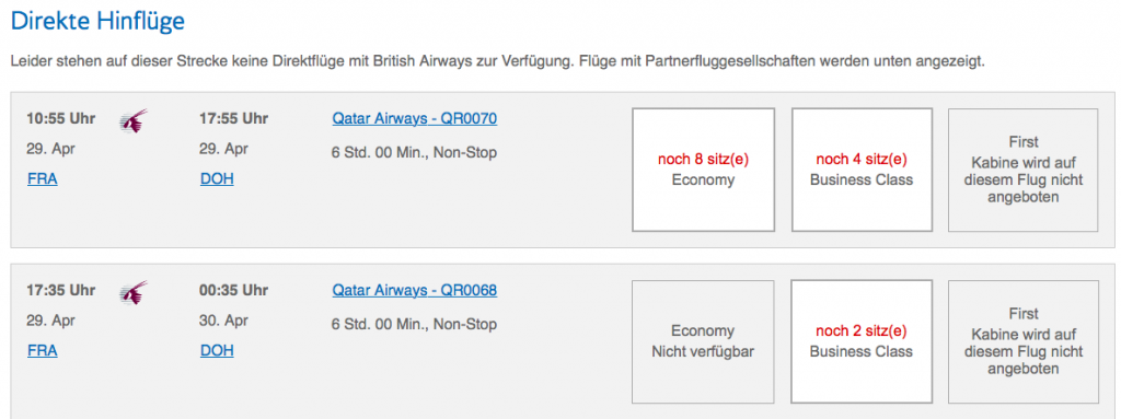 Leider lassen sich Qatar Airways Prämienflüge auch nicht online bei American Airlines suchen und buchen. Allerdings kann man sehr einfach auf der Webseite von British Airways die Verfügbarkeit ermitteln und anschließend telefonisch bei AAdvantage buchen.