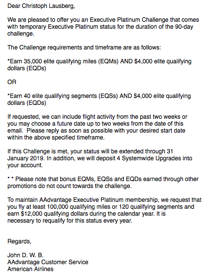 Den Status bei American AAdvantage erhaltet Ihr temporär für 3 Monate. In diesen drei Monaten müsst Ihr eine Challenge erfüllen um den Status bis 31. Januar 2019 zu verlängern. Den Startpunkt der Challenge kann man von dem Zeitpunkt der Genehmigung per Email zwei Wochen in die Zukunft oder die Vergangenheit legen, um auch vergangene Flüge nutzen zu können.
