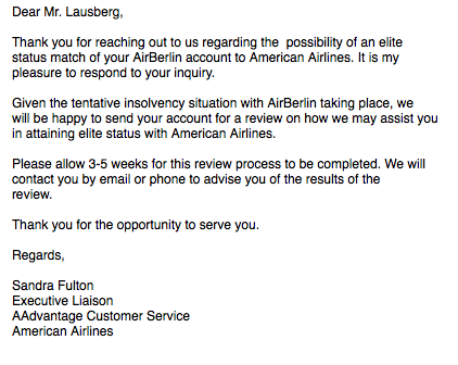 - Über das Kontaktformular in meinem AAdvantage Account habe ich auf meinen topbonus Platinum Status, sowie die airberlin Insolvenz hingewiesen und um einen Staus Match gebeten.