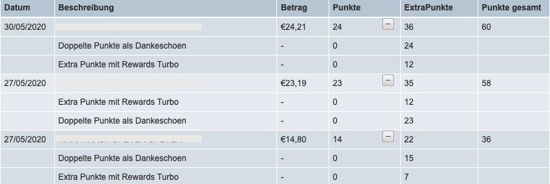 Zusätzlich sammelt man mit dem aktivierten Punkte Turbo von American Express noch einmal 0,5 extra punkte pro Euro, sodass man auf insgesamt 2,5 Membership Rewards Punkte pro Euro kommt.