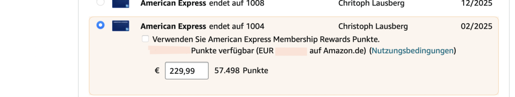 Wenn man ein Zahlungsmittel auswählt, sieht man die Option zum Zahlen mit Punkten bei einer hinterlegten American Express Hauptkarte. Hierbei wird bei Amazon direkt angezeigt, wie viele Membership Rewards Punkte man zur Verfügung hat und wie viel diese auf Amazon.de wert sind.